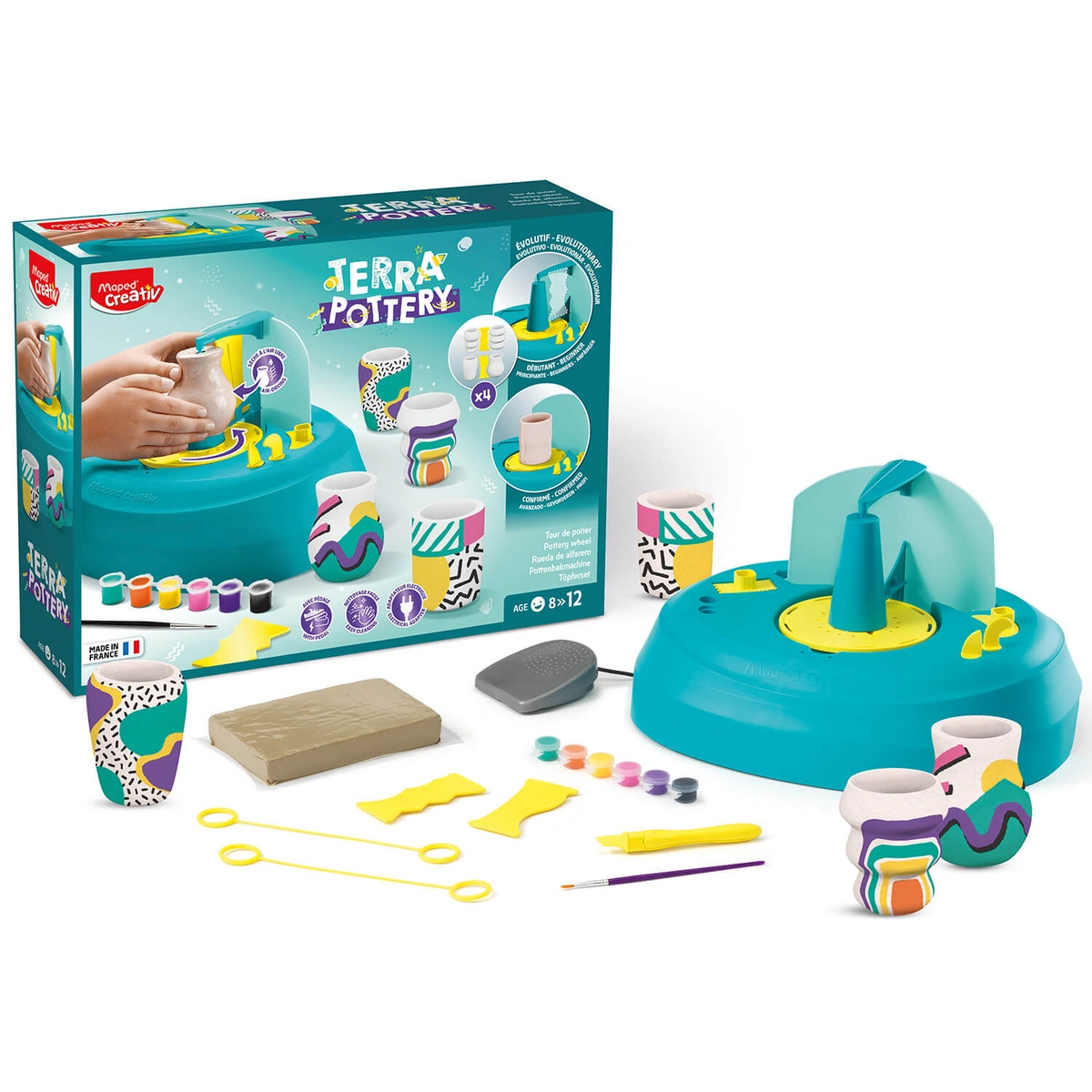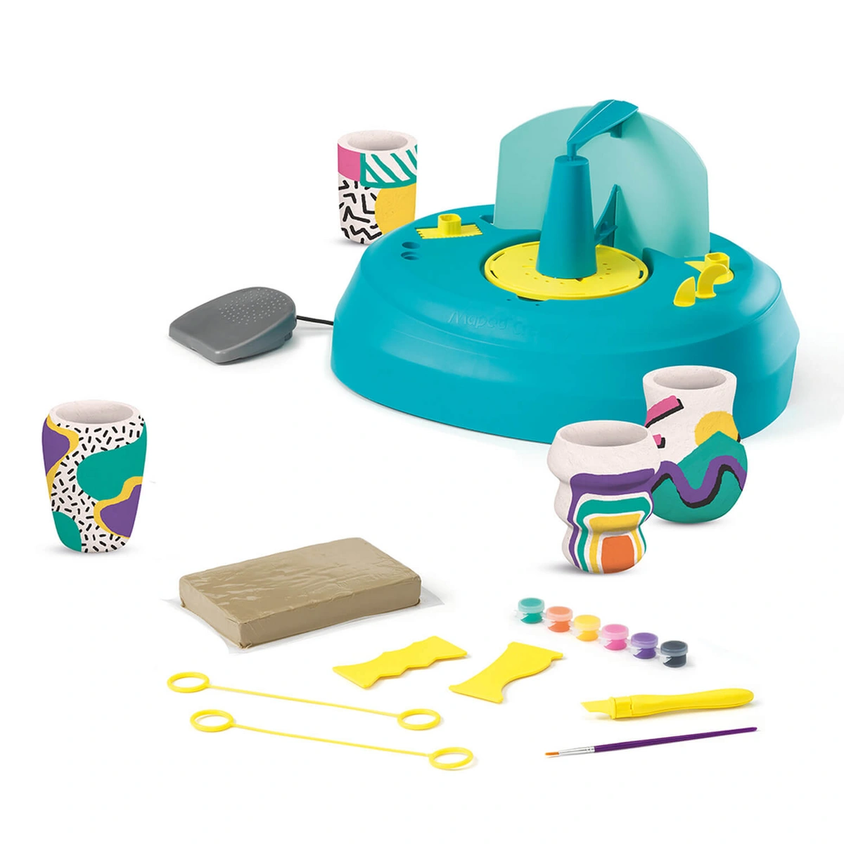 Pracownia ceramiki artystycznej w wykonaniu Maped Creativ. Koło garncarskie napędzane silnikiem dla entuzjastów garncarstwa, do tworzenia oryginalnej i pięknie zdobionej ceramiki: wazonów, misek i kubeczków – wszystkiego, co podpowie wyobraźnia! Gotowe naczynia z gliny samoutwardzalnej same wysychają, nie trzeba ich wypalać w piecu. Farby w 6 kolorach i pędzelek umożliwią ich przyozdobienie zgodnie z własną koncepcją autora. Zabawa rozwija wyobraźnię, zmysły twórcze i zdolności manualne.
