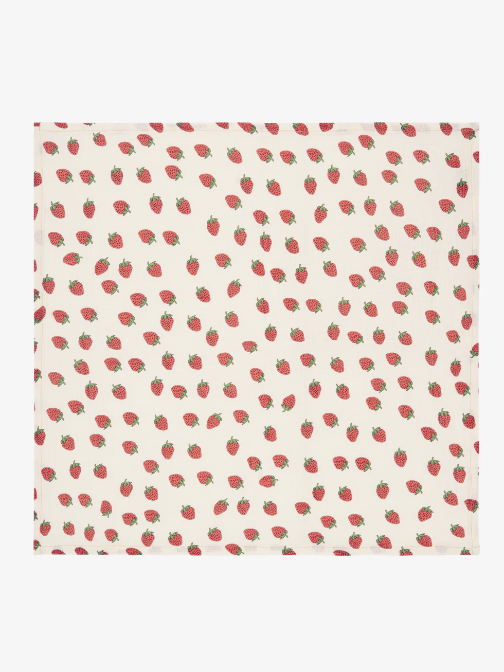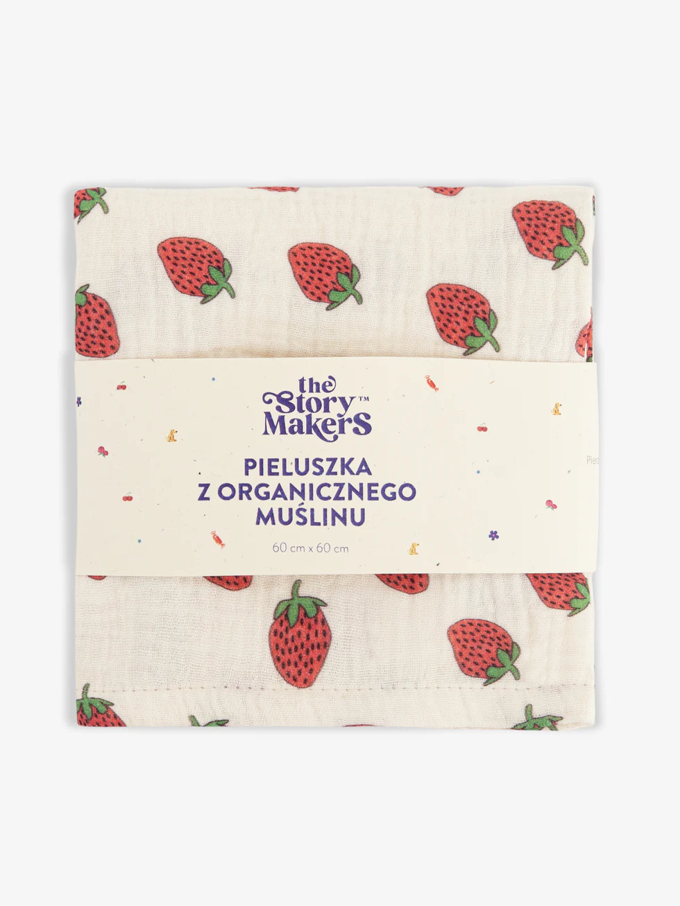 Miękka i urocza pieluszka z bawełny organicznej z certyfikatem GOTS. Posiada jednostronny nadruk w truskawki. Jest to produkt niezbędny podczas karmienia, pielęgnacji oraz codzienności maluszka.